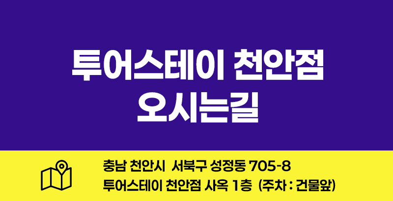 주최 : 투어스테이천안점 / 주소 : 충남 천안시 서북구 성정1길 24-1 투어스테이 천안점 사옥대표 : 탁경림 / 개인정보 책임관리자 : 신기순 사업자등록번호: 312-27-32663 / 관광사업자등록번호: 제2004-5호통신판매사업신고번호: 제2011-충남천안-198호Copyright ⓒ sweetty.co.kr All rights reserved.